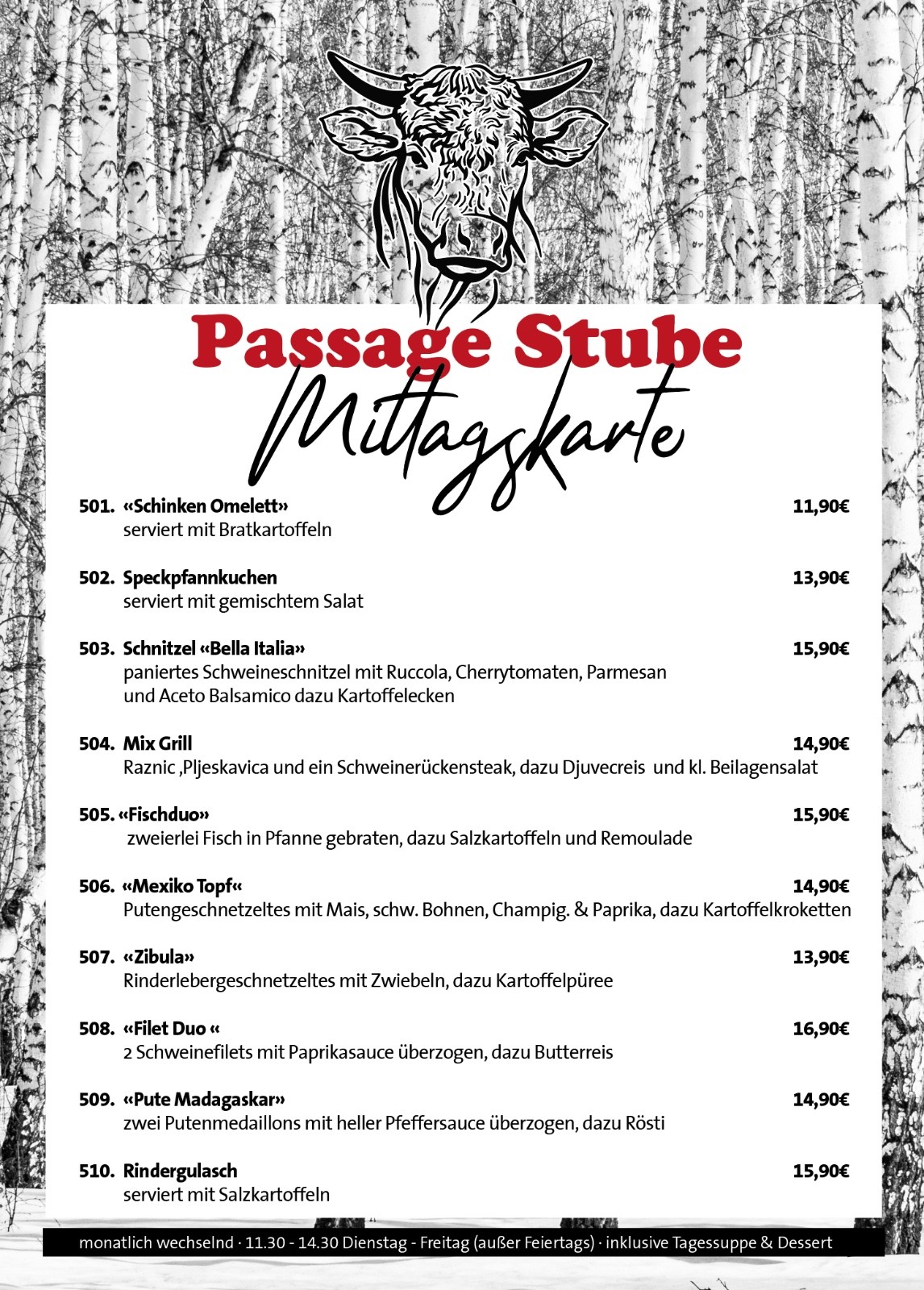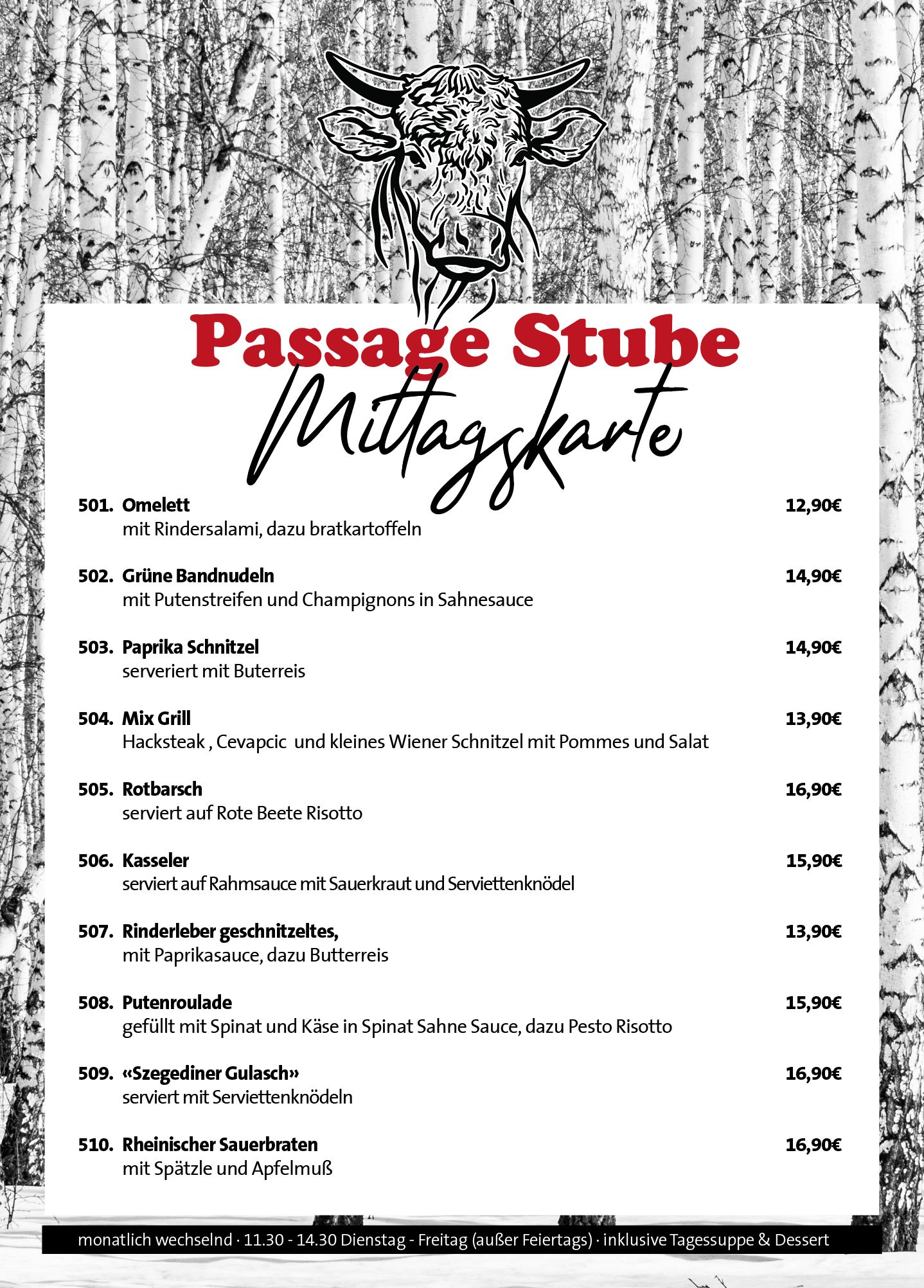 Sie möchten während Ihres Mittagstisches mal etwas anderes essen außer ein paar Brötchen, Currywurst und einen Kaffee? Dann besuchen Sie doch einfach unser Steakhaus Passage-Stube und genießen Sie mal etwas anderes in Ihrer Mittagspause.